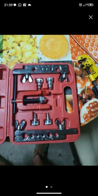Juego de herramientas para tubos. Está en buen estado y listo para usar. - Incluye varias boquillas de diferentes tamaños. - La herramienta está en una caja de plástico roja.