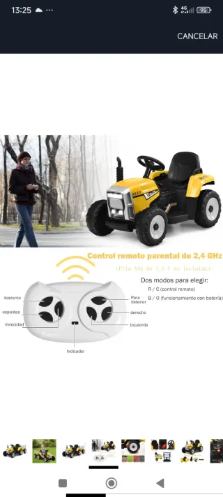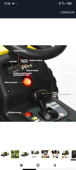 Tractor amarillo a batería con remolque. La bateria dura - Ruedas grandes y resistentes. - Volante para dirigir. - Asiento cómodo.