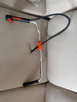 Brazo de desbrozadora con manillar y cable. - Manillar con agarre negro y detalles naranjas. - Cable flexible negro. - Soporte naranja para el cable.