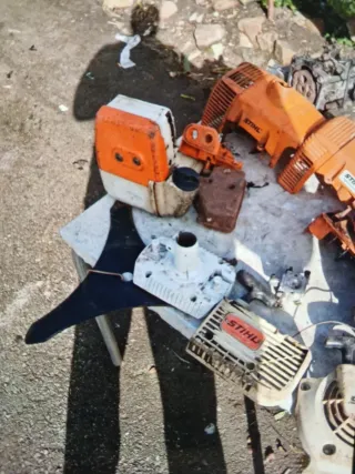 Se vende lote de motores de desbrozadora Stihl. 50€ para piezas sin. Garantía - Incluye varias carcasas y piezas. - Se aprecian logos de Stihl en varias partes.