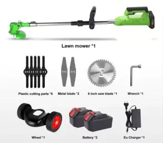 Desbrozadora eléctrica a batería, ideal para el cuidado de tu jardín. Incluye varios accesorios para diferentes tipos de corte. - Desbrozadora a batería *1 - Baterías de litio *2 - Cargador de enchufe europeo *1 - Rueda de apoyo *1 - Cuchillas de plástico *5 - Cuchillas metálicas *2 - Hojas de sierra de 6 pulgadas *2 - Llave inglesa *1 - guantes de protección - gafas de protección