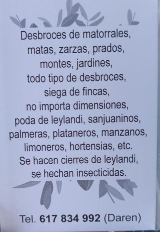 Desbrozes de matorrales matas zarzas prados montes jardines todo tipo de desbrozes siga de fincas no importan dimensiones , poda de leilandi sanjuaninos palmeras plataneros hortensias etc se pone balla de ercules,echan insecticidas solo Asturias Avilés jijon pola Siero Langreo Pravia pola Laviana Luanco Candás corneyana Lugones Oviedo nava etc contacto: guasap 617834992 y darenhernandez272@gmail.com Saludos