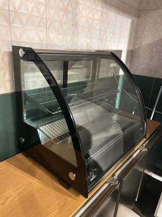 Vitrina expositora con diseño curvo y elegante, ideal para negocios. - Estructura de cristal y metal negro. - Dos estantes interiores. - Base de madera.