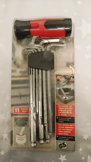 Set de 11 llaves Allen con mango universal ajustable. Incluye puntas esféricas para facilitar el acceso en zonas difíciles. - 11 piezas. - Mango universal ajustable. - Puntas esféricas. - Fabricadas en acero al cromo-vanadio.