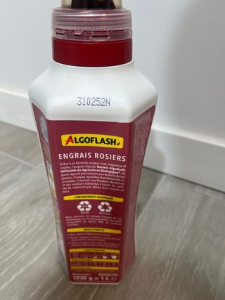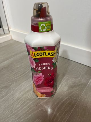 Abono líquido Algoflash para el cuidado de tus rosales. Su fórmula completa promueve una floración abundante y tallos vigorosos. - Botella con 90% y 100% de material reciclado.