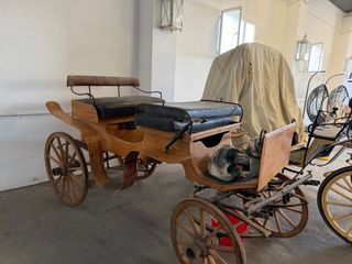 Elegante coche de caballos de estilo clásico de madera, perfecto para eventos, ferias o coleccionistas. • Precio negociable - Asientos tapizados en tela. - Ruedas de radios con detalles en rojo. - Faros decorativos en la parte delantera.