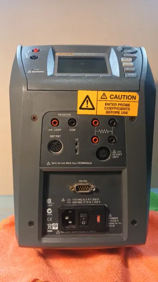 Calibrador sondas de temperatura de precisión Fluke 9142. Equipo robusto y fiable para mediciones exactas. - Pantalla LCD. - Botones de control: SET PT, °C/°F, MENU, EXIT. - Conexiones: mA LOOP, COM, REF PRT, TC. - Puerto RS-232. - Conector de alimentación AC. - Indicadores de advertencia y precaución.
