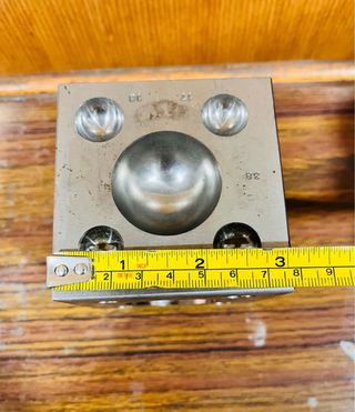 Herramienta de joyería para embutir. Este bloque de metal tiene varias cavidades semiesféricas de diferentes tamaños para dar forma a metales. - Bloque de embutir de metal. - Múltiples cavidades semiesféricas. - Marcado con números de tamaño.