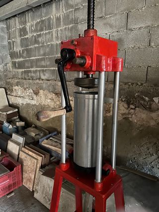 Embutidora hidráulica de color rojo, ideal para la preparación de alimentos. Posibilidad de transporte incluido en el precio - Construcción robusta. - Diseño vertical.