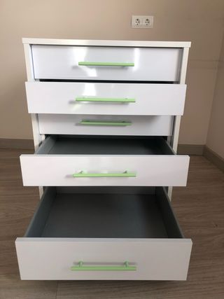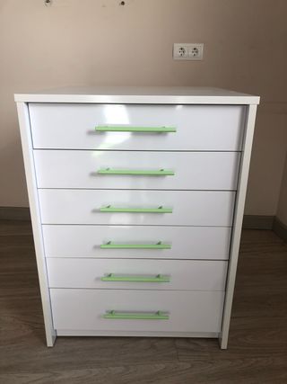 Cajonera blanca con un diseño moderno y tiradores de color verde. - Seis cajones amplios. - Acabado brillante en la estructura. - Tiradores de barra verdes.