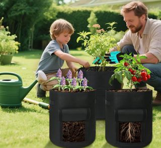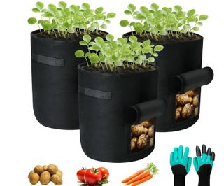 Set de 3 bolsas de cultivo para patatas. Perfectas para cultivar tus propias patatas en casa. - Material de fieltro transpirable. - Con ventanas para facilitar la cosecha. - Asas para un fácil transporte.