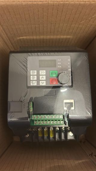 Variador de frecuencia (VFD) para control de motores. - Pantalla digital. - Botones de control: RUN, STOP/RESET, PRG/ESC, RD/WT, MF.K/REV. - Dial giratorio para ajuste de parámetros. - Conexiones de tornillo para cableado.