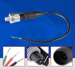 Sensor de presión. Presión máxima 100 PSI = 7 bar aprox. Compatible con aire, agua, aceites, etc. Rosca 1/8" NPT (cónica) Alimentación: 5V DC Salida 0,5-4,5V 0 PSI = 0,5V 50 PSI = 2,5V 100 PSI = 4,5V Precision: 2% Se suministra sensor + conector rápido. Disponibles versiones de 30, 100, 150, 200, 300 y 500 PSI