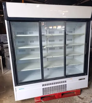 Expositor refrigerado de la marca Infrico con tres puertas correderas. La medida es de 2 metros de alto x 1.87 de ancho x 77 de fondo - Diseño moderno y funcional. - Amplio espacio interior. - Acabado blanco.