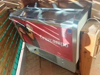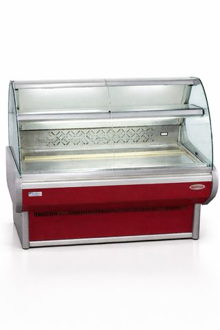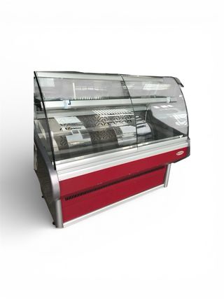 Vitrina expositora de la marca INFRICO, ideal para carnicerías. Sus dimensiones son 140 cm de largo por 90 cm de fondo y alto 123 cm. - Diseño moderno y funcional. - Estructura robusta. - Acabado en color rojo burdeo.