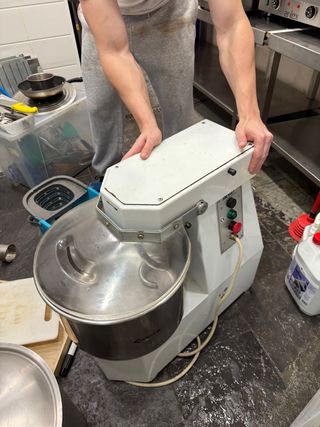Amasadora industrial de gran capacidad, ideal para negocios de hostelería o panadería. - Bol de acero inoxidable. - Diseño robusto y duradero. - Panel de control con botones de encendido y apagado Funciona perfectamente 380V