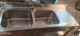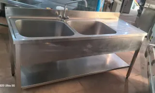 Fregadero industrial de doble seno fabricado en acero inoxidable. Ideal para cocinas profesionales o negocios. - Construcción robusta en acero inoxidable. - Dos cubetas amplias. - Diseño funcional y duradero.