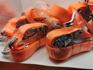 Lote de 10 cinchas de amarre con carraca, completamente nuevas. Cinta resistente en color naranja con ganchos metálicos fuertes. Perfectas para asegurar carga en remolques, furgonetas, bacas, motos, quads, electrodomésticos o en mudanzas. Sistema de carraca que permite tensar fácil y rápido con gran firmeza. Se entregan tal como se ven en las fotos. 📦 Envío disponible.