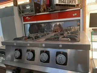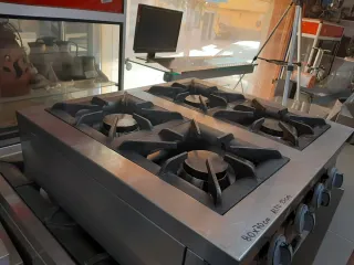 Cocina industrial de acero inoxidable con cuatro quemadores. Ideal para negocios de hostelería. - Fabricada en acero inoxidable. - Cuatro quemadores de alta potencia. - Superficie de fácil limpieza. - Medidas: 80x70 cm x 23 cm alto