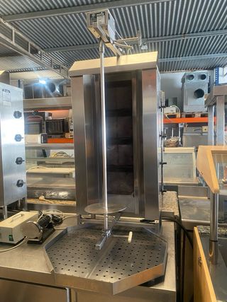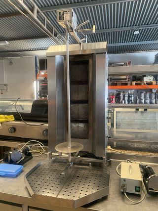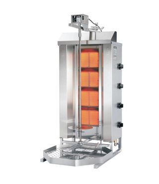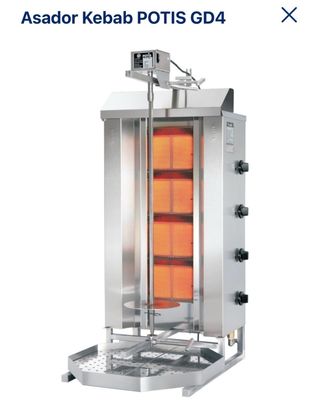 Asador de kebab marca POTIS, modelo GD4 S. Ideal para preparar kebabs de forma profesional. - Construcción en acero inoxidable. - Quemadores de gas. - Eje giratorio para cocción uniforme.