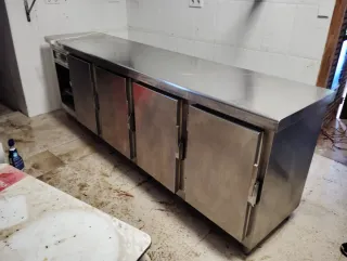 Nevera expositora de acero inoxidable con cuatro puertas. - Diseño moderno y funcional. - Superficie de trabajo amplia. - Puertas con apertura independiente.
