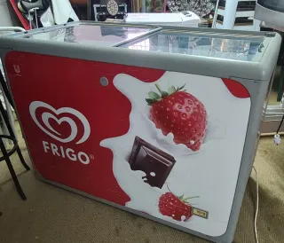 Congelador horizontal con puertas correderas de cristal. - Diseño llamativo con imágenes de fresa, frambuesa y chocolate.