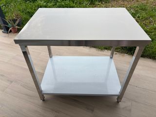 Mesa de trabajo de acero inoxidable, ideal para cocinas o talleres. - Superficie lisa y resistente. - Estructura robusta.