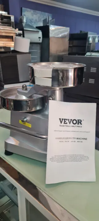 Prensa para hacer hamburguesas de la marca VEVOR, modelo JKH-100. Ideal para preparar fácilmente tus propias hamburguesas. - Construcción robusta en metal. - Diseño compacto y funcional.