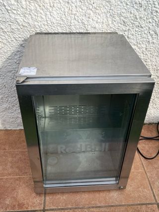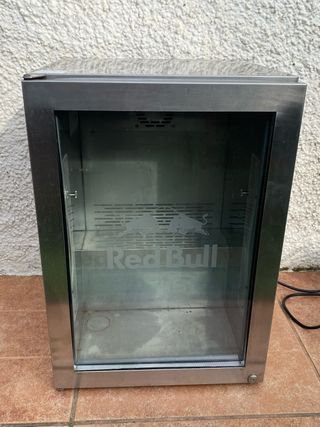 Nevera expositora de la marca Red Bull con acabado metálico y puerta de cristal. - Diseño moderno y elegante. - Interior espacioso para bebidas. - Logo de Red Bull grabado en el cristal. - Sin bandeja - Hay que cambiar las luces