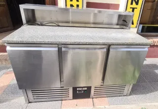Mesa refrigerada de acero inoxidable con encimera de granito. - Tres puertas frontales. - Panel de control digital. - Diseño robusto y profesional.