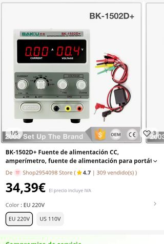 La fuente de alimentación BK-1502D+ es un equipo profesional para reparación de portátiles y dispositivos electrónicos, ofreciendo un voltaje de salida ajustable entre 0 y 15 V y una corriente máxima de 2 A. Dispone de pantalla digital para mostrar voltaje y corriente en tiempo real, con alta precisión y estabilidad de salida (<0,01% + 2 mV de fluctuación), bajo ruido (<3 mArms) y tiempo de recuperación rápido (<100 μs). Soporta múltiples voltajes intermedios (1,5 V, 3,6 V, 4,8 V, 6 V, 7,2 V) y mantiene estabilidad ante cambios de carga (<0,2% + 3 mA). Su rango de operación es de -10°C a 80°C, y el rango de almacenamiento de -...