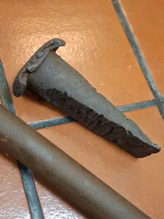 Herramientas de metal para trabajos pesados. - Maza con mango largo soldado, de tubo de hierro. La maza es de la marca Bellota de 5kg. - Cuña de unos 3kg. Maza con mango de unos 8kg.