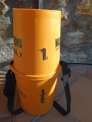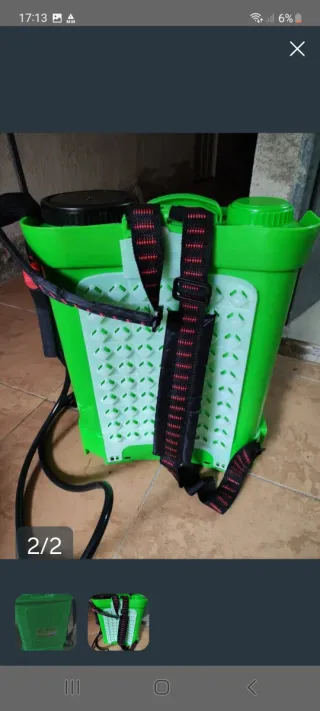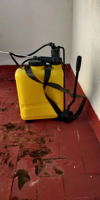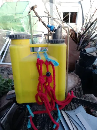 Mochila fumigadora de color amarillo, ideal para el cuidado de jardines y cultivos. Se encuentra en buen estado. - Capacidad de 15 litros. - funciona a la perfección. Lo que no tiene son las correas, yo les he puesto unas cuerdas y van bien.
