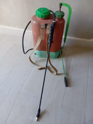 Mochila para fumigar y aplicar líquidos. Funciona muy bien - Depósito de plástico resistente. - Correas ajustables para llevar en la espalda. - Varilla de pulverización con mango.