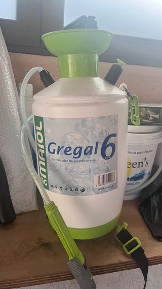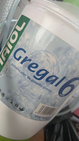 Fumigador de presión previa marca Gregal. - Capacidad de 6 litros. - Color blanco y verde. - Incluye manguera y lanza de fumigación.