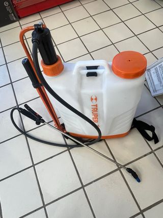 Fumigadora de espalda Truper de 16 litros, completamente nueva y sin usar. - Capacidad de 16 litros. - Color blanco con detalles naranjas. - Incluye manguera y lanza de fumigación.