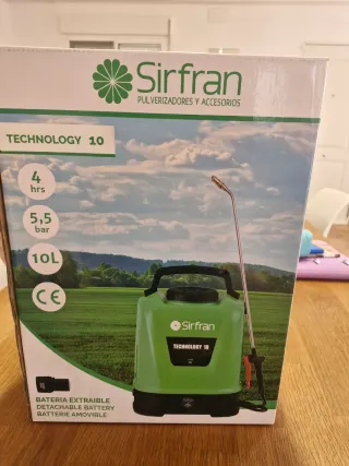 Máquina de fumigar eléctrica Sirfran con capacidad de 10 litros. Ideal para el cuidado de jardines y cultivos. - Asa de transporte y boca de llenado amplia. - Correas acolchadas y ajustables para mayor comodidad. - Respaldo acolchado para soporte dorsal. - Presión regulable hasta 5.5 bar. - Amplia base para mayor estabilidad. - Batería extraíble.