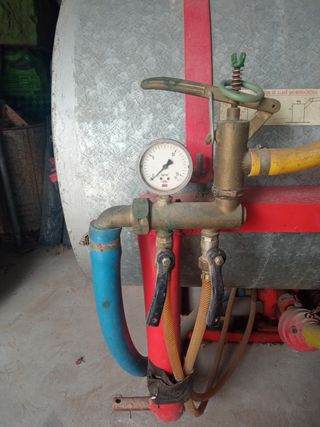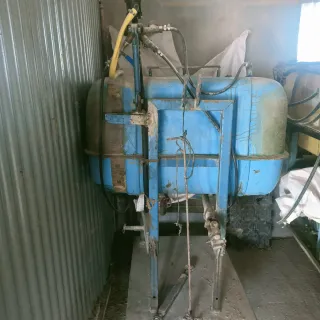 Fumigadora para tractor con depósito azul y estructura metálica. - Capacidad visible en la escala del depósito. - Incluye manómetro y mangueras. 7 años parada. Funcionaba.