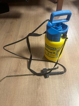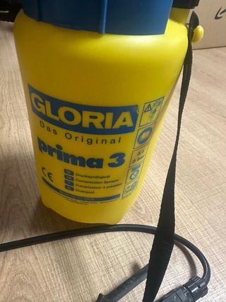 Pulverizador a presión de la marca GLORIA, modelo Prima 3. Ideal para diversas tareas. Tiene 3 usos - Color amarillo y azul. - Correa para colgar. - Lanza de pulverización.