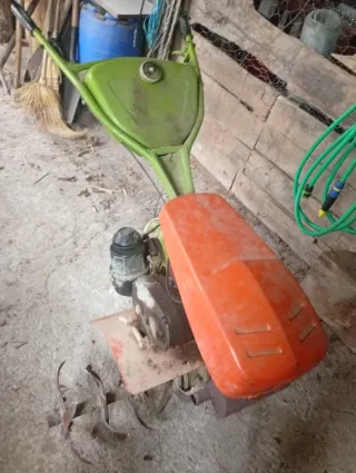 Motocultor rotativo de color verde y naranja. Ideal para piezas o para quien sepa repararlo. - Motor de gasolina. - Manillar ajustable. - NO FUNCIONA (se desconoce la averia) Cualquier duda preguntar