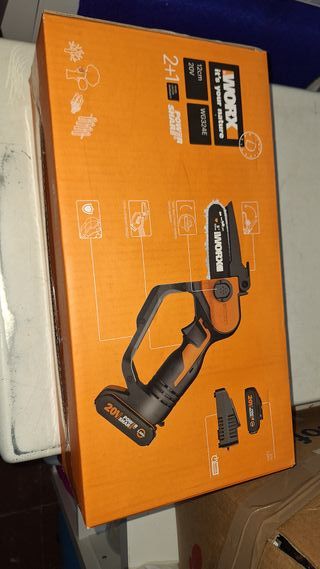Mini motosierra Worx WG324E, ideal para trabajos de poda y corte. - Modelo: WG324E - Voltaje: 20V - Longitud de espada: 12cm - Sistema Power Share