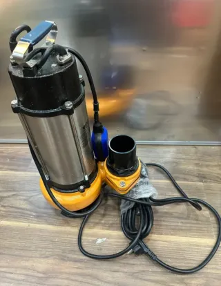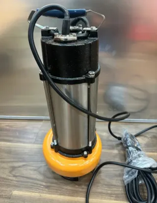 Bomba de achique sumergible con flotador. Ideal para desagües y vaciado de aguas. - Cuerpo principal de acero inoxidable. - Base de hierro naranja. - Asa de transporte azul y metálica. - Cable de alimentación negro.