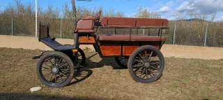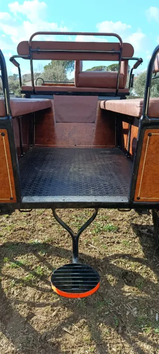 Carruaje de maratón de gran tamaño, ideal para eventos o exhibiciones. - Asientos de cuero marrón. - Suelo de goma antideslizante. - Detalles en madera. - Estructura metálica negra.