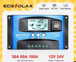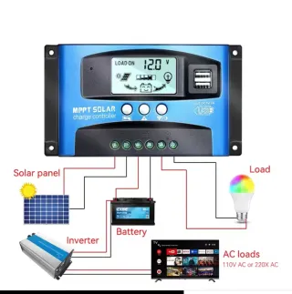 Controlador de carga solar MPPT con pantalla LCD y puertos USB. - Corriente de carga máxima: 100A. - Voltaje de batería automático: 12V / 24V. - Salida USB: DC5V/2A.
