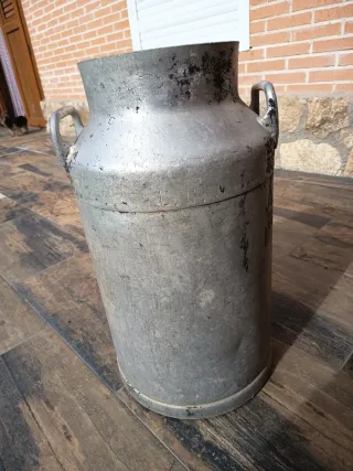 Este cántaro de leche antiguo es un objeto decorativo con un diseño clásico. - Material aluminio - Dos asas laterales para facilitar su transporte. - Boca ancha y cilíndrica. tiene el desgaste de muchos años pero no está roto . 60cm alto x35 ancho 40 l