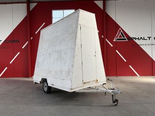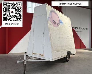 Remolque publicitario de gran tamaño con forma rectangular. Ideal para colocar anuncios o mensajes. - Estructura blanca. - Puerta lateral. - Rueda de apoyo. - Neumáticos nuevos. Medidas: - Alto: 260 - Ancho: 170 - Largo: 300