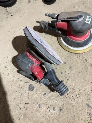 Lijadora neumática orbital con disco de 150 mm. - Cuerpo principal en rojo y negro. - Conexión para aspiración de polvo. - Incluye disco de lija.
