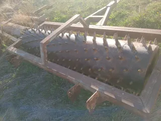 Rodillo agrícola con un diseño robusto y funcional. - Cilindro metálico con púas. - Estructura de soporte verde. 330 cmtros de ancho de trabajo, 60 diametro del rodillo, falta alguna púa. Gran estructura y peso. Sin ruedas.