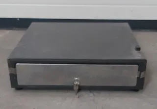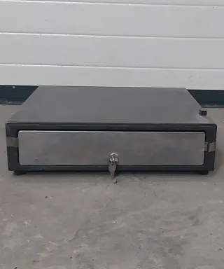 Cajón de efectivo con cerradura y llave. - Diseño metálico plateado. - Color negro.