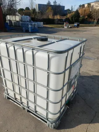 Contenedor de gran capacidad para líquidos. - Capacidad de 1000 litros. - Estructura metálica de protección. - Palet integrado de acero inox para fácil manejo. - Tape y grifo. **CON PALÉ DE MADERA: 40 €**